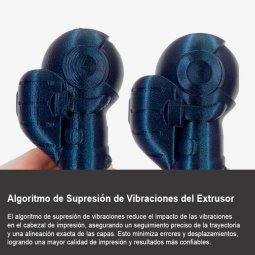 El algoritmo inteligente detecta y contrarresta las vibraciones del extrusor en tiempo real, asegurando que el cabezal siga la trayectoria designada con máxima precisión. Esto minimiza el desplazamiento entre capas y mejora significativamente la calidad de impresión.